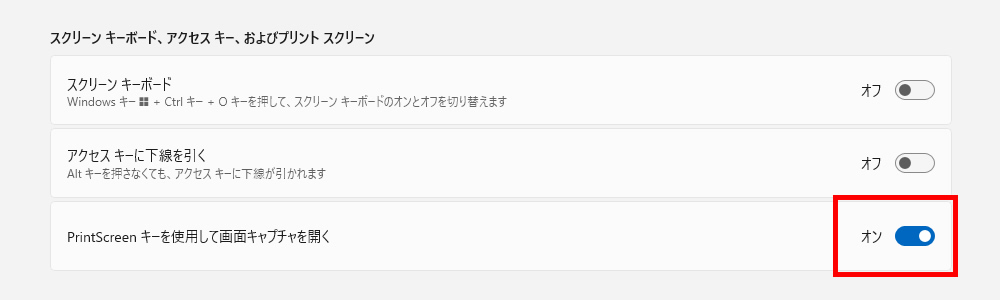 設定>アクセシビリティ>キーボード> 「PrintScreenキーを使用して画面キャプチャを開く」のスイッチを切り替える